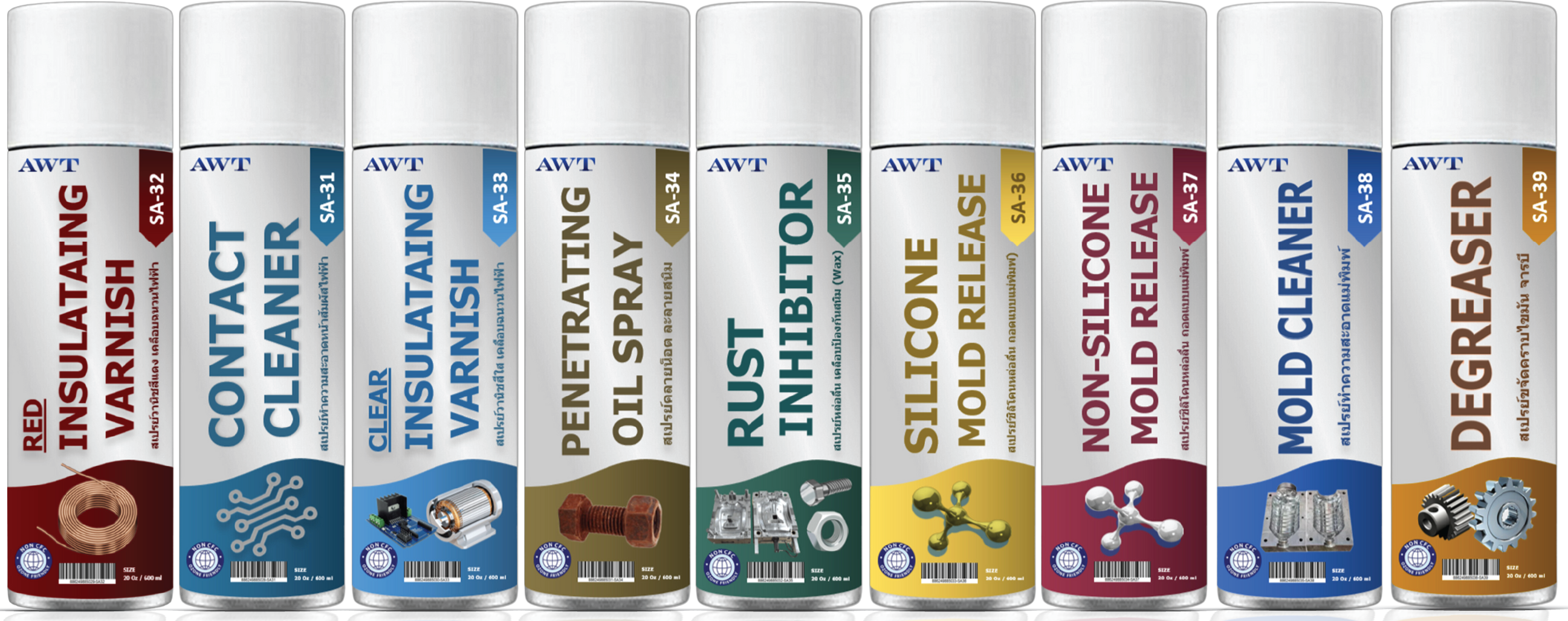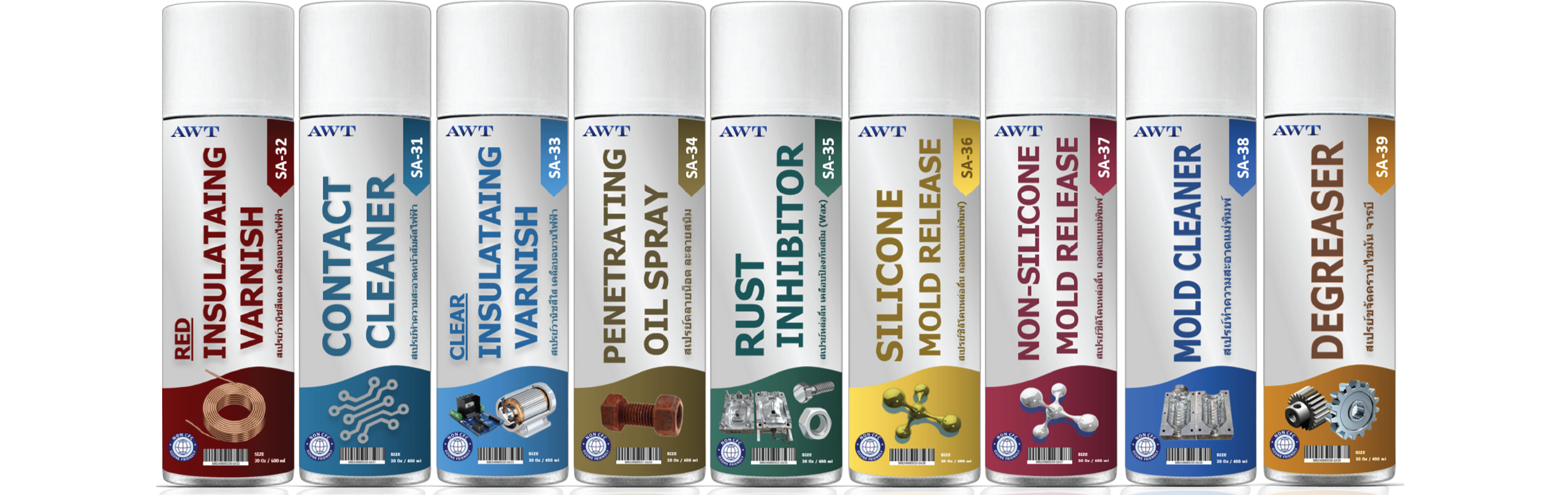 สเปรย์ฟู้ดเกรด ถอดแบบแม่พิมพ์ หล่อลื่นป้องกันสนิม มาตรฐานรับรอง FDA NSF (H1) สเปรย์คอนแทคคลีนเนอร์ สเปรย์ล้างหน้าสัมผัสวงจรไฟฟ้า สเปรย์ล้างมอเตอร์ไฟฟ้าและอุปกรณ์ไฟฟ้า สเปรย์ซิลิโคนหล่อลื่นถอดแบบแม่พิมพ์ สเปรย์ถอดแบบแม่พิมพ์ ชนิดพิมพ์สีติด (ไม่มีสารซิลิโคน) สเปรย์ล้างคราบไขมัน สเปรย์เคลือบป้องกันสนิมชนิดฟิล์มใส (Wax) สเปรย์คลายน็อต ละลายสนิม สเปรย์วานิชสีแดง เคลือบขดลวดทองแดง สเปรย์วานิชสีใส เคลือบเงาใส เคลือบฉนวนไฟฟ้า สเปรย์ทำความสะอาดแม่พิมพ์ สเปรย์ฉีดสายพานป้องกันการลื่นไถล สเปรย์โอเพ่นเกียร์