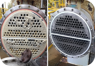 เคมีล้างตะกรันและสนิม ในระบบ Heat Exchanger, Cooling Tower, Chiller, Boiler, Condenser, Evaporator, Extruder, Oil Cooler, เครื่องจักร และระบบทำน้ำร้อน-น้ำเย็น ในโรงงานอุตสาหกรรม (ชนิดเข้มข้นประสิทธิภาพสูง) ออกฤทธิ์แทรกซึมเข้าย่อยสลายผลึกตะกรัน สนิม หินปูน ตะไคร่น้ำ เมือกรา จุลินทรีย์ คราบน้ำมัน และสิ่งสกปรกต่างๆ ที่ยึดเกาะอุดตันให้สามารถหลุดออกได้ง่ายในเวลาที่รวดเร็ว เสริมด้วยสารยับยั้งการกัดกร่อนคุณภาพสูง ที่สร้างชั้นฟิล์มเคลือบปกป้องพื้นผิวโลหะและวัสดุในระบบท่อส่งน้ำทั้งหมด
